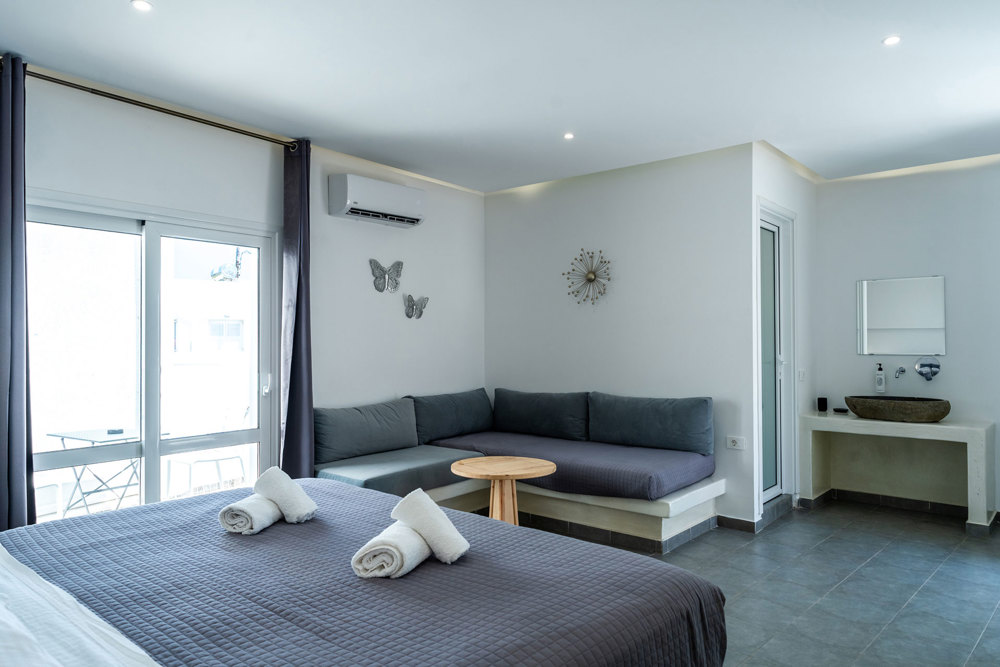 The Junior Suite offers a comfortable and elegant space for up to 3 adults or 2 adults with 1 child. With its sophisticated design and modern amenities, this suite provides the perfect balance of style and functionality. Featuring a spacious layout, the Junior Suite is ideal for guests seeking a relaxing stay in Santorini, whether for a romantic getaway or a family vacation.